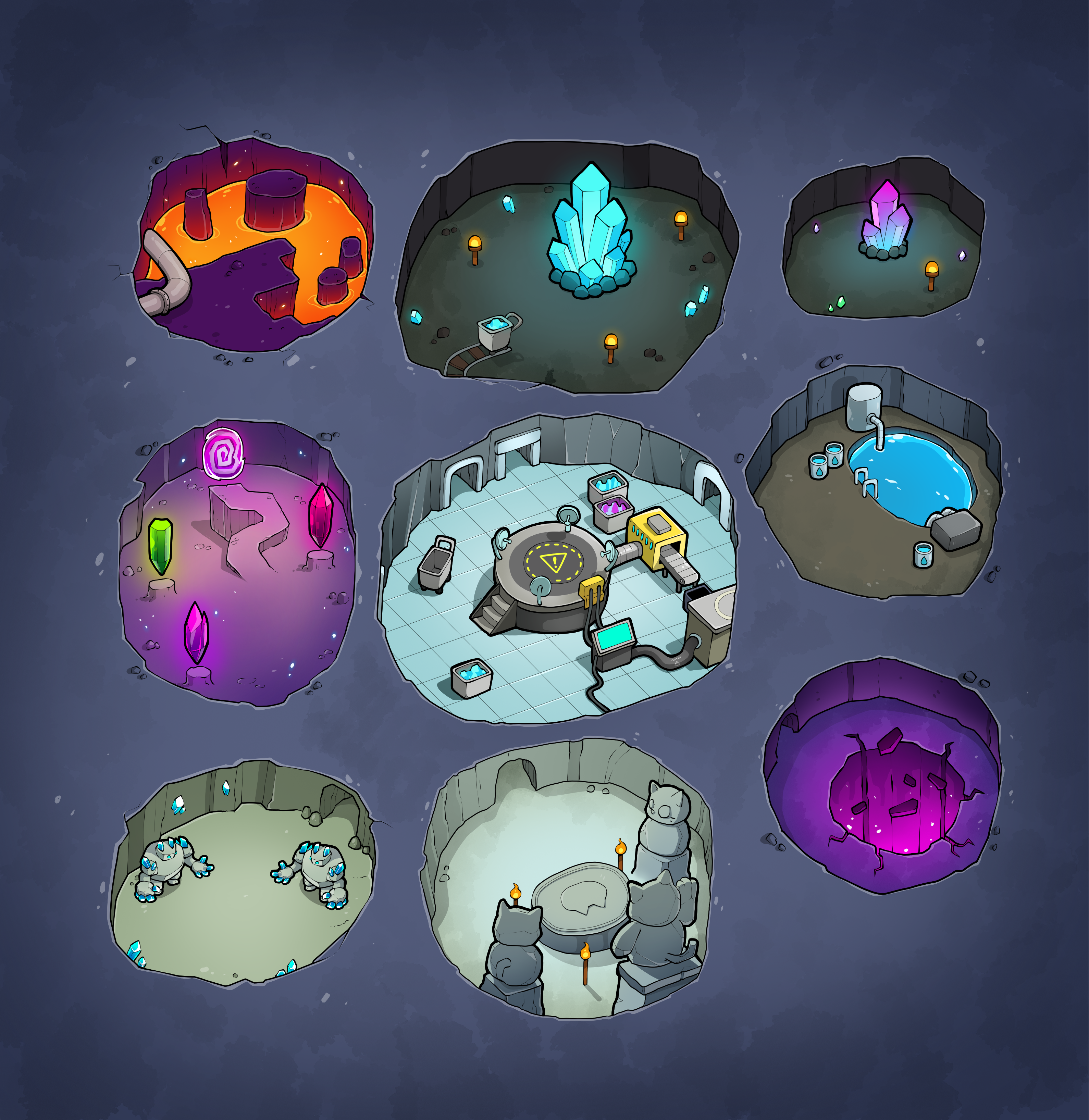 Mining Caves: Each features unique mineral compositions and environments: lava veins, crystal chambers, magical rifts, water caverns, fungal grottos, and monster dens.